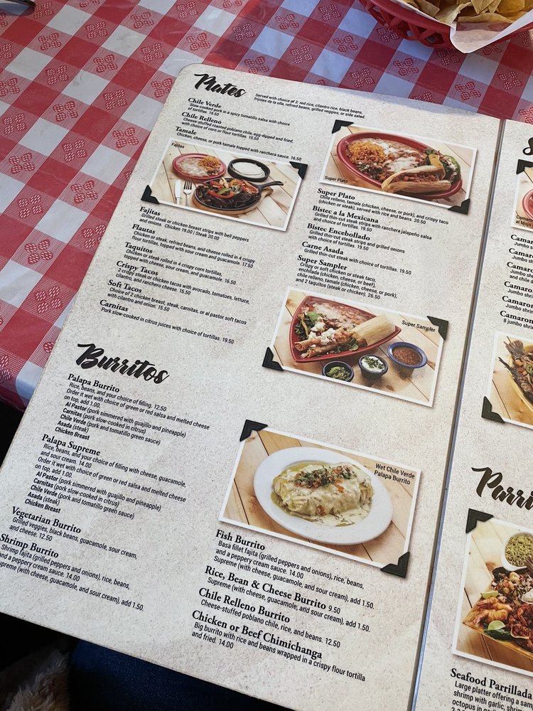 Sampling of Palapa's Finest Meat and Seafood: Chile verde, Carnitas, Pollo Adobado, Carne Asada, Tilapia, Camarones al Ajo, Camarones, Diabla, Filete Fajita, Green Rice, Refried Beans